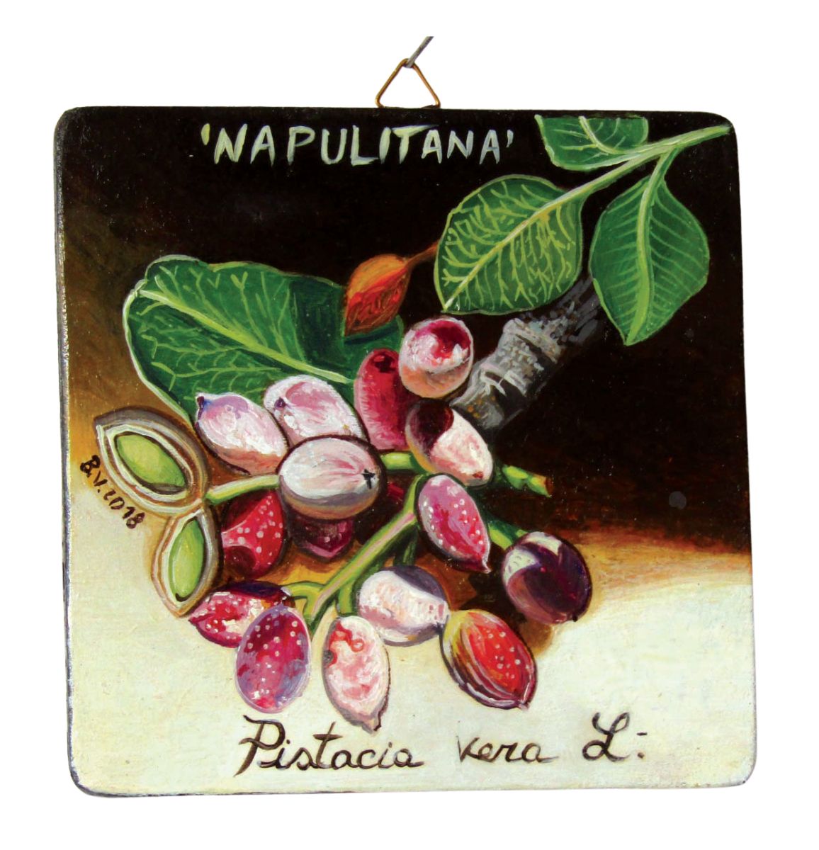 The piece depicts the Bronte DOP Pistachio, a highly prized fruit widely appreciated and sought after in European and Japanese markets. Also known as “green gold,” it features distinctive characteristics, including the fact that it grows and develops on volcanic lava stone.